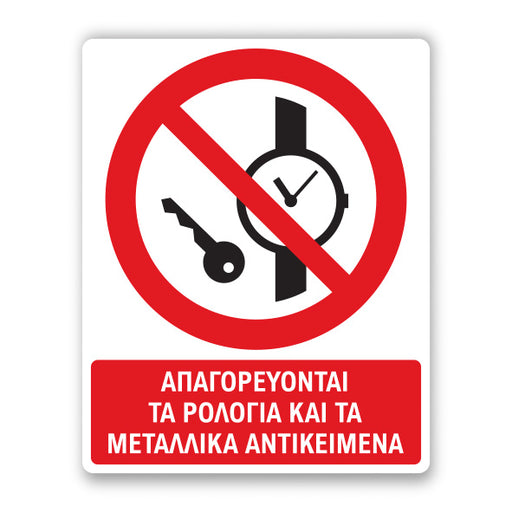 Δες ΠερισσότεραΠινακίδα Απαγόρευσης με Τίτλο Απαγορεύονται τα Ρολόγια και τα Μεταλλικά Αντικείμενα A39Διαθέσιμο σε 4 διαστάσεις: 160mm X 200mm, 200mm X 250mm...