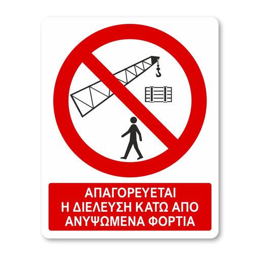 Δες ΠερισσότεραΠινακίδα Απαγόρευσης με Τίτλο Απαγορεύεται η διέλευση Κάτω από Ανυψωμένα Φορτία A38Διαθέσιμο σε 4 διαστάσεις: 160mm X 200mm, 200mm X 250mm, 26...