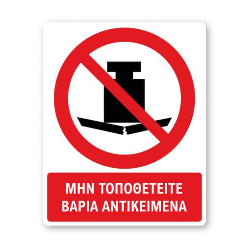 Δες ΠερισσότεραΠινακίδα Απαγόρευσης με Τίτλο Μην Τοποθετείτε Βαριά αντικείμενα A46Διαθέσιμο σε 4 διαστάσεις: 160mm X 200mm, 200mm X 250mm, 260mm X 325mm, 320...