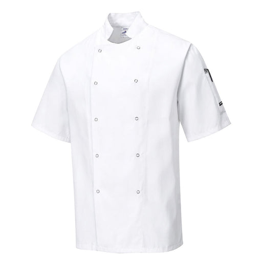 Cook jacket with light and fresh fabric, for a long lasting comfort With short sleeves With passable buttons 1 Chest and sleeve pocket 6...