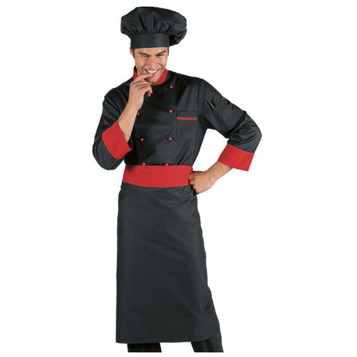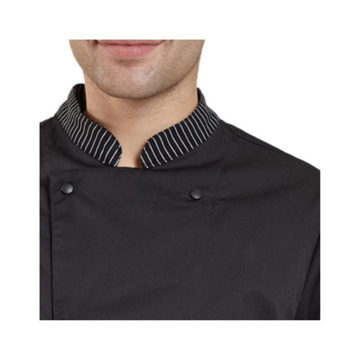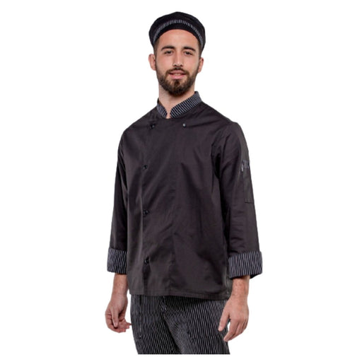 Chef jacket Chef's jacket with striped details on the neck and cuffs. It closes in the front with a trick. One pocket and pen holder on the left sl...